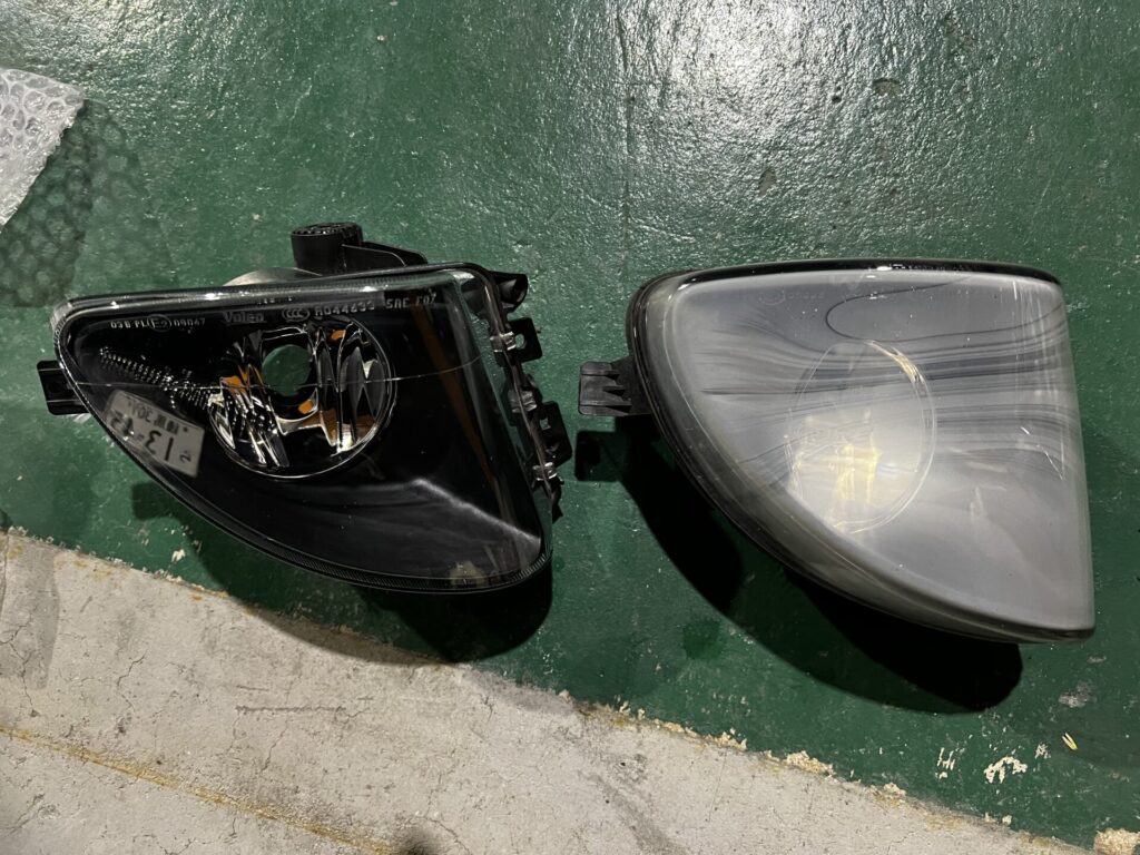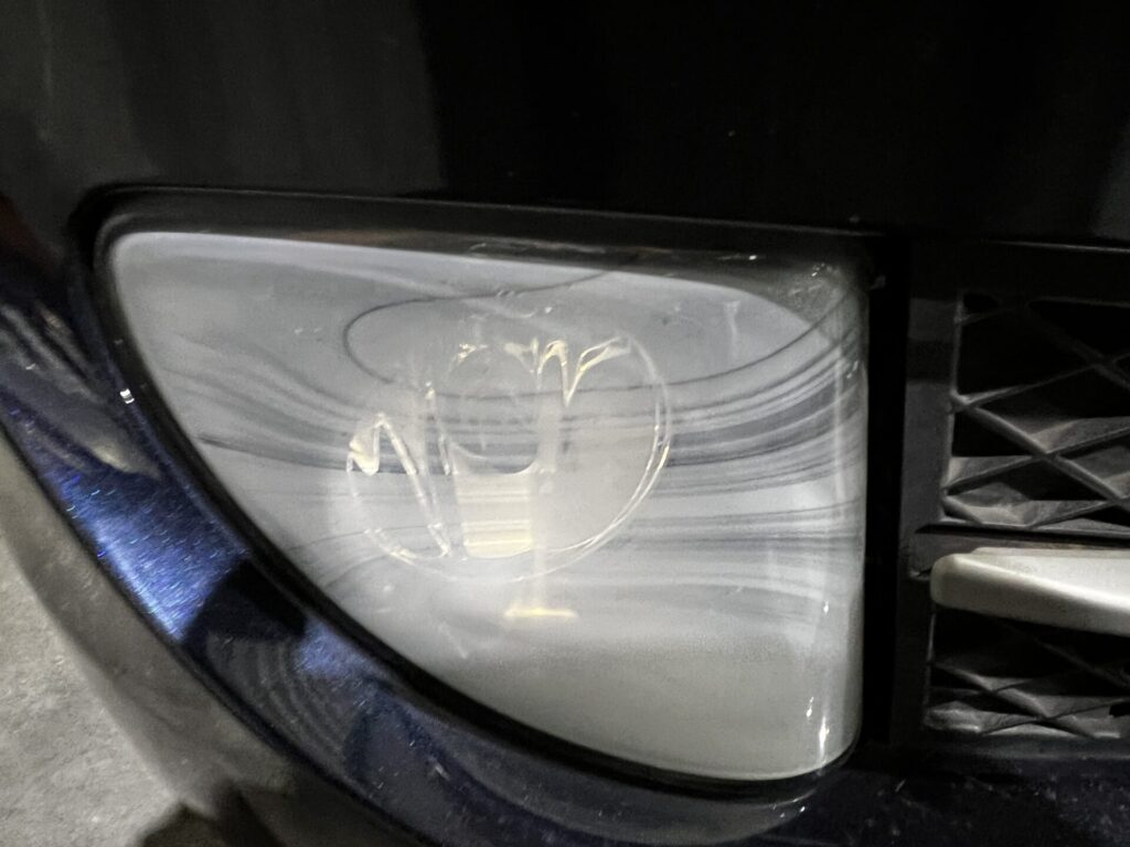 写真をご覧の通り、右のフォグライトが真っ白に曇ってしまっています。