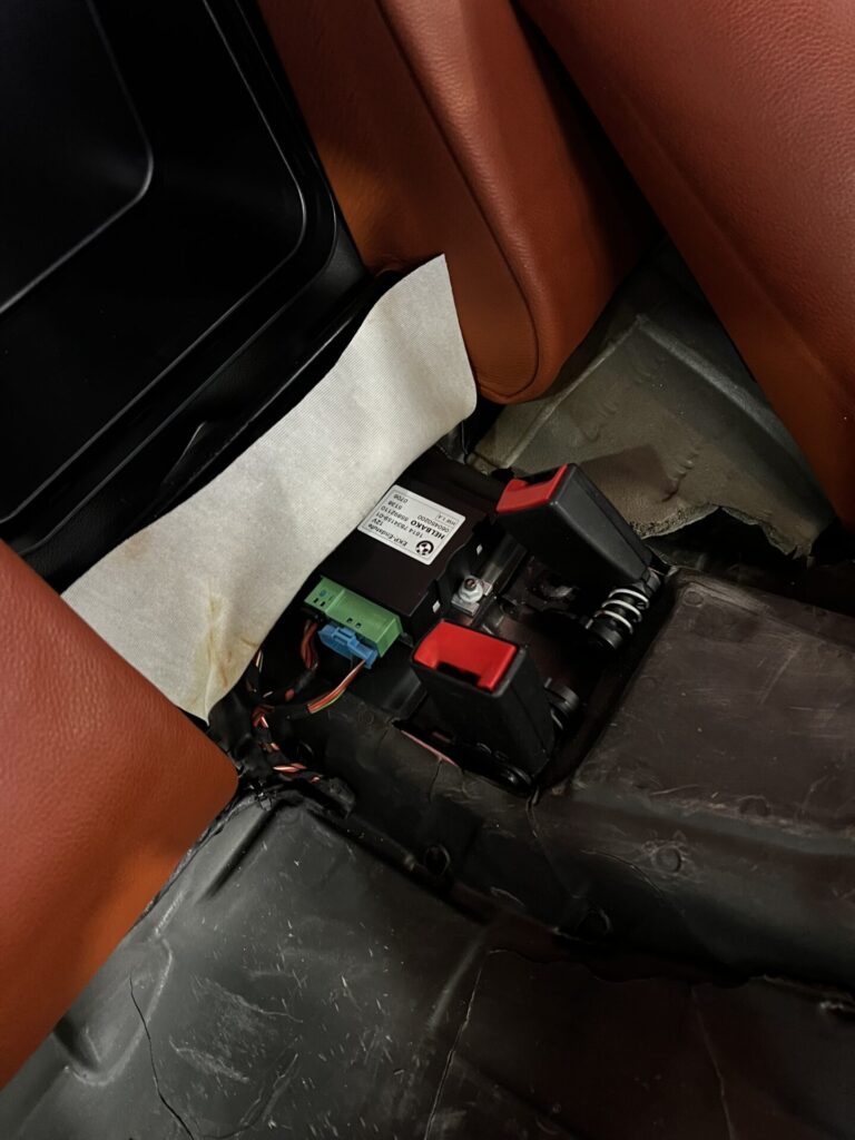 シートベルトキャッチ部にある黒い箱がEKP(フューエルポンプ制御ユニット)になります。