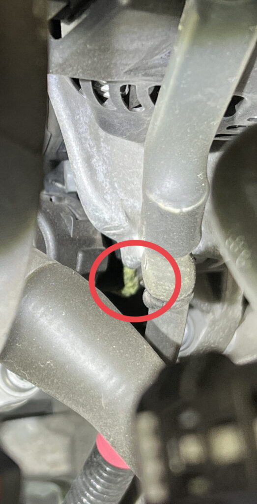〇印の所にクーラントが漏れて、緑色の液が固まっり層になっています