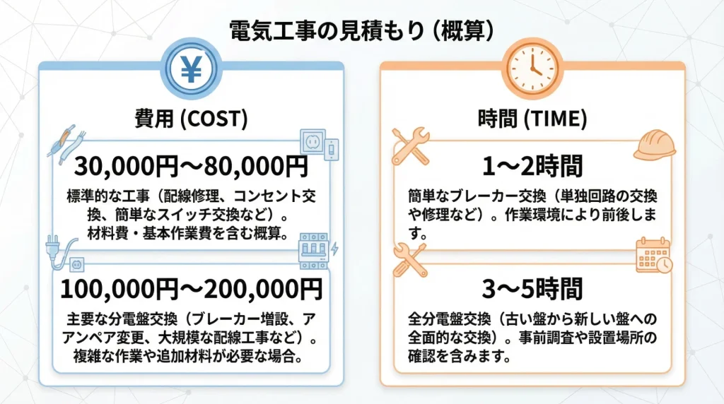 多くのお宅では、半日から1日程度で工事が完了します。費用はブレーカーの数や分電盤の種類によって変わりますが、おおよそ10万円〜20万円が目安です。