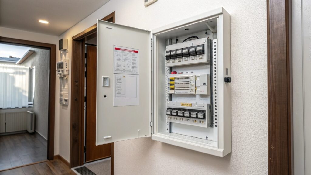 玄関や洗面所の壁についている、あのグレーや白の箱。ブレーカーが並んでいるあの場所です。「ブレーカーが落ちたときくらいしか見ない」という方がほとんどかもしれませんが、この分電盤こそが、家中の電気を安全に届けてくれている大事な存在なんです。